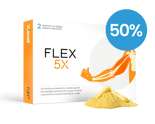 Muskler og ledd som fungerer bedre Flex5x tar vare på muskler og ledd. Kosttilskuddet kombinerer effektive næringsstoffer. Vitamin K2 bidrar til å styrke beinvev og beindannelse, og D3 bidrar til å opprettholde normal muskelfunksjon. Hold dine muskler og ledd sunne og friske! Prøv Flex5x i dag og få prøvepakke til 50% rabatt